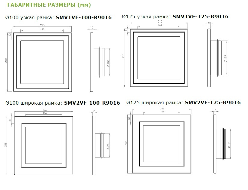 i-VALVE®ACERO доступны в следующих диаметрах: Ø100 и Ø125. Оба диаметра имеют вариант с узким и широким краем рамки, также на монтажном фланце установлен резиновый уплотнитель для предотвращения утечки воздуха сбоку.