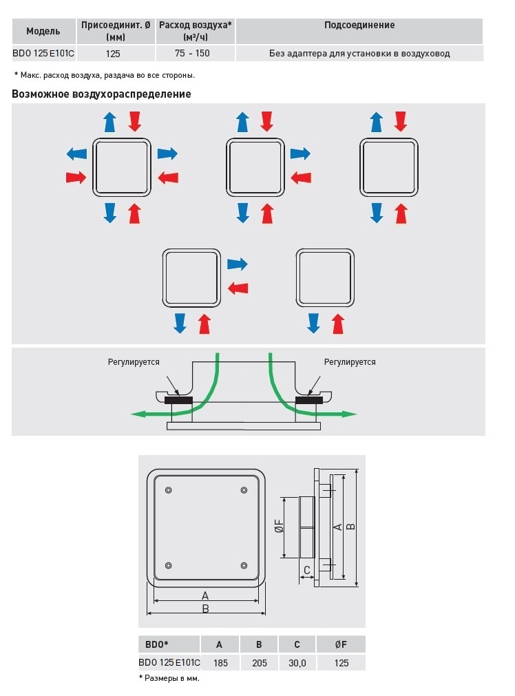 При использовании в приточных системах возможна настройка направления и длины струи.