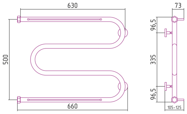 Весьма незамысловатый внешний вид, водяного полотенцесушителя Сунержа, модели «М-образный», с внешними габаритами – 500 мм в высоту, и 650 мм в ширину.
