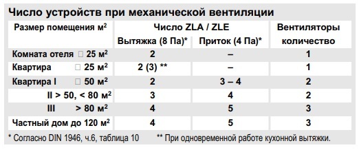 Необходимое число устройств определяется согласно нормам DIN 1946, ч.6 в зависимости от величины помещения и силы ветра (см. таблицу ниже).