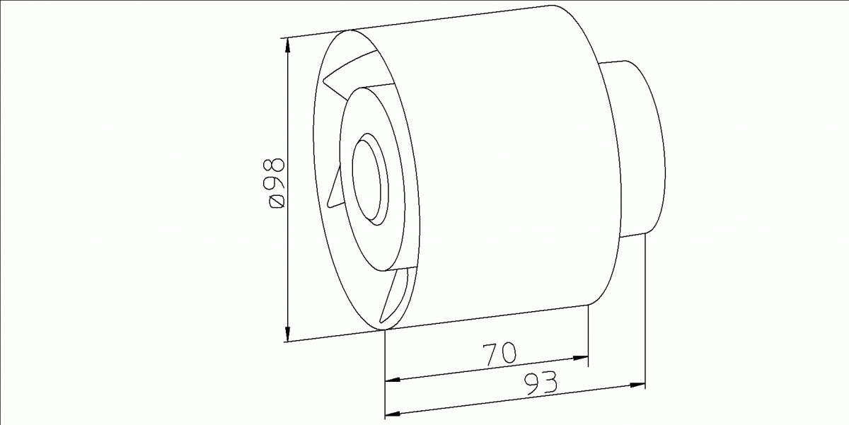 Вентилятор, монтируемый в трубу. Имеет шариковые подшипники. Установка в вытяжной воздуховод, осевая конструкция, прямой привод. Вставка из пластика с гладкими торцами, предназначена для вставки в трубы номинальным диаметром 100 мм. Крыльчатка с 5 профилированными пластиковыми лопатками, отличается высоким КПД. Двигатель переменного тока с расщеплёнными полюсами и системой защиты от перегрева в режиме непрерывной эксплуатации, имеет не требующие обслуживания шариковые подшипники с запасом смазки, рассчитанным на длительный период эксплуатации. Двигатель не реверсивный.